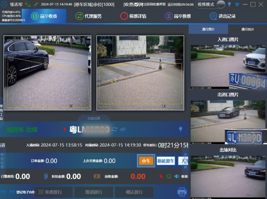 二、位于车位后部的摄像头(一个摄像头可以管理相邻的两个车位)可及时识别进出车辆的车牌号并将开始充电时间、结束充电时间及超时等信息一并反馈给道闸管理系统,在该车辆驶出道闸时判断是否有超时占用充电车位的情况,如果有则按照相关收费规则收取充电资源占用费,车主在缴纳相关费用后抬杆放行;如果没有则会根据实际充电时长对道闸收费进行折扣或减免,以解决重复收费的问题。